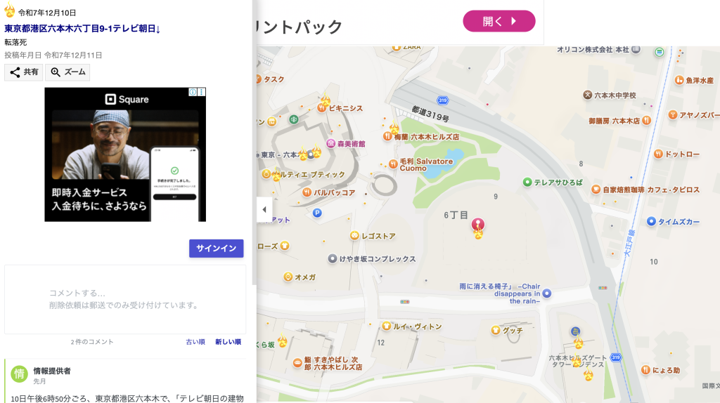 | 発生場所 | 東京・六本木にあるテレビ朝日の本社社屋7階です。 |